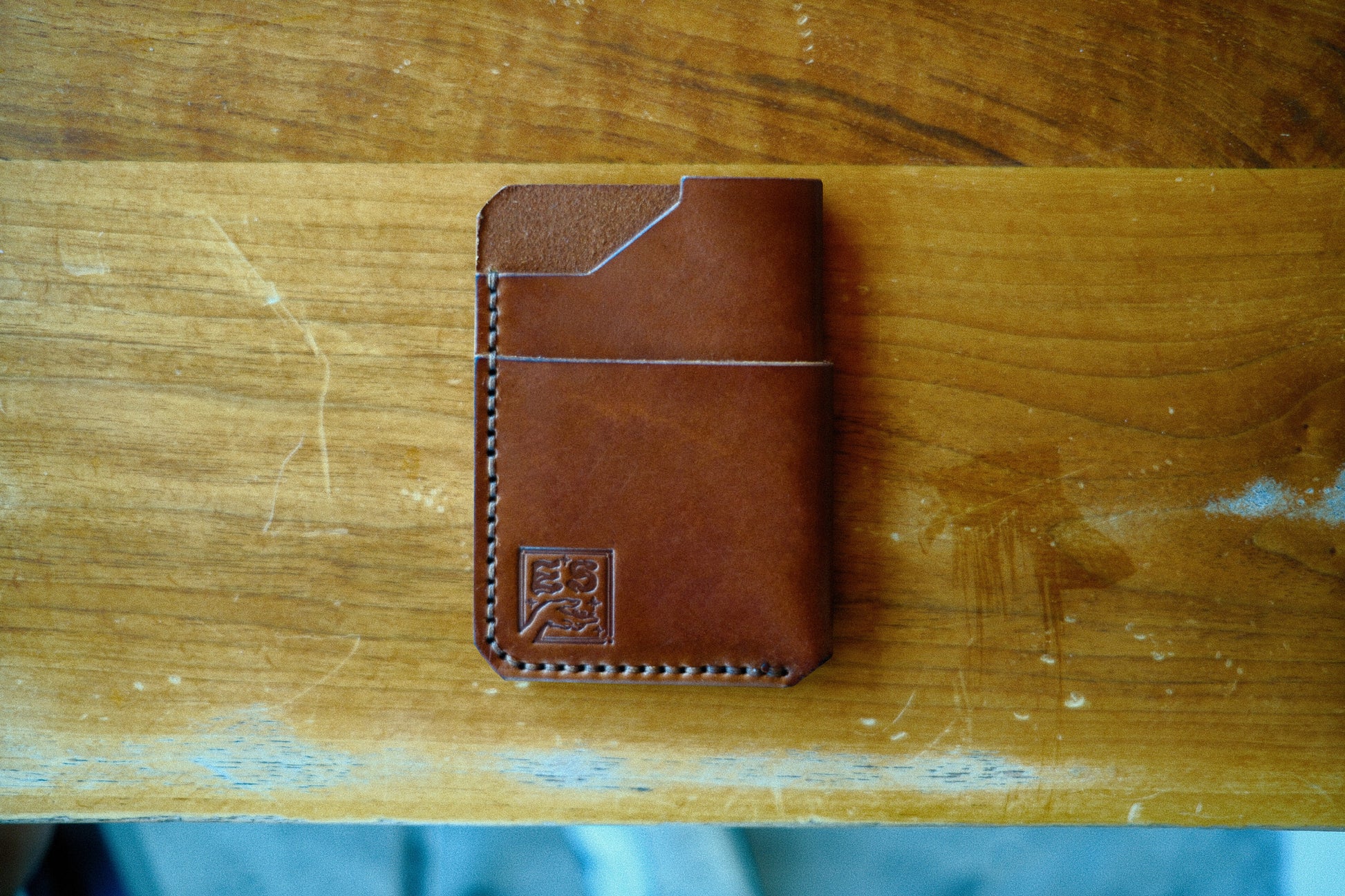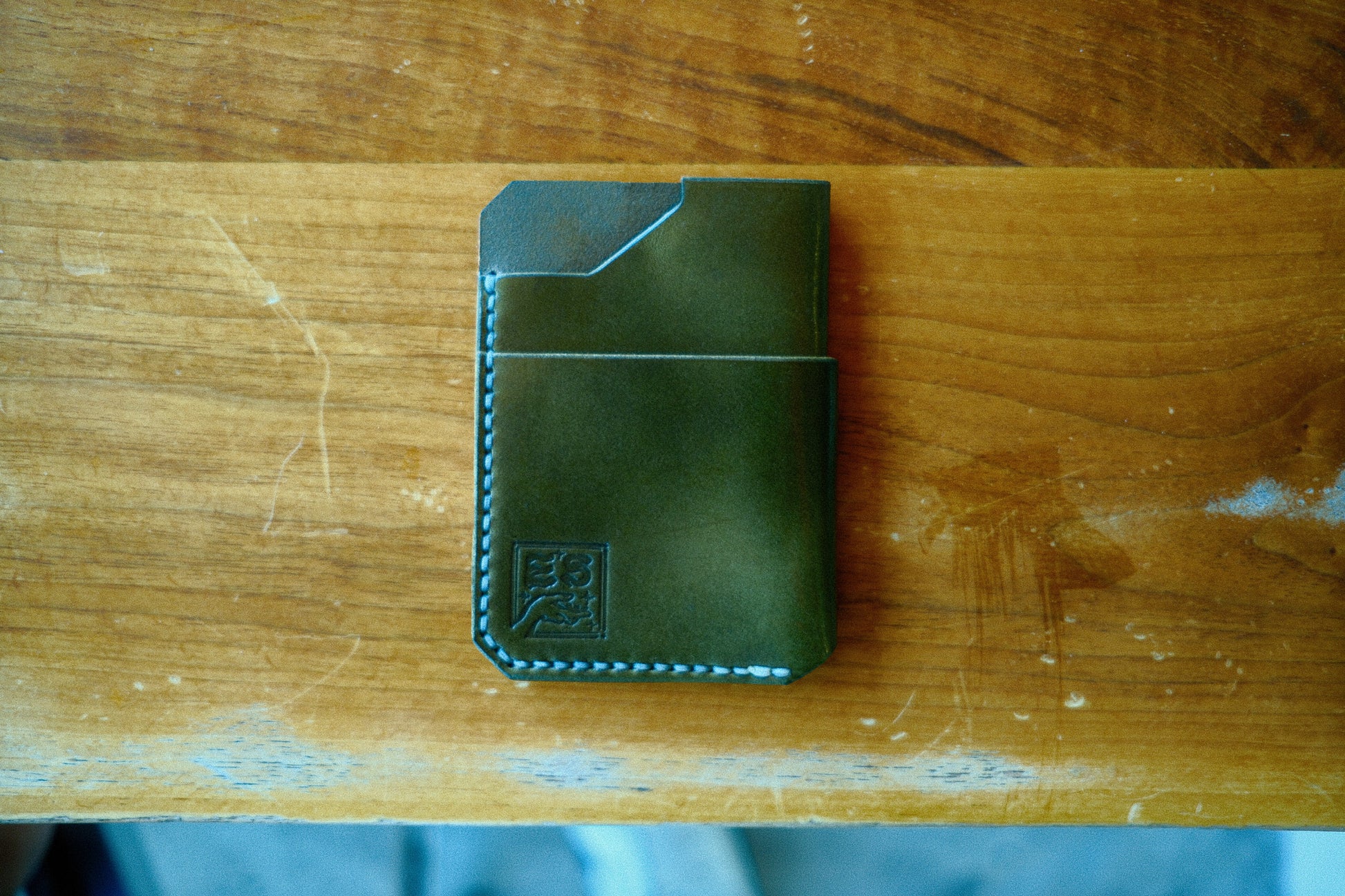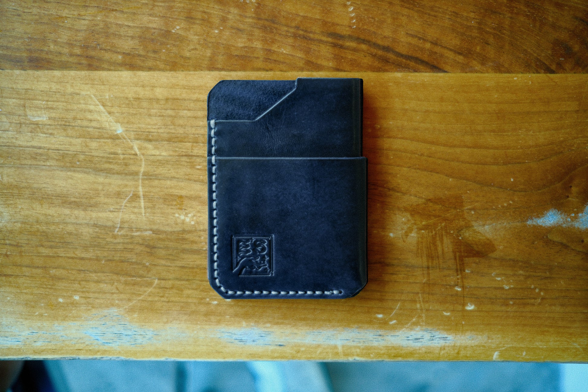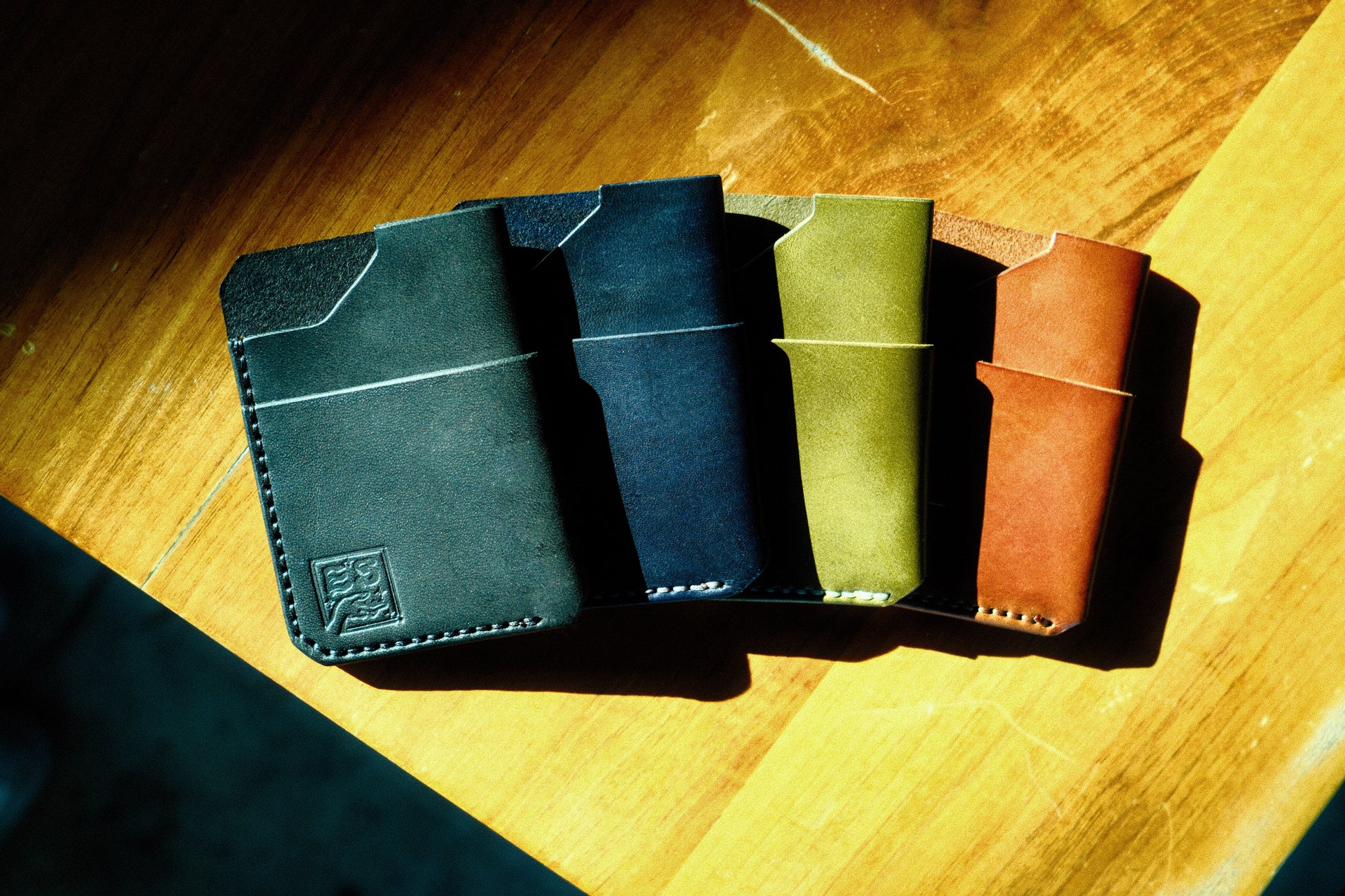 We make our wallets with Wickett & Craig's Glazed Harness which is a full-grain vegetable-tanned leather proudly made here in the USA. They have a firm feel and will patina handsomely over the years. They're available in the following colors: Dark Slate, Cement Blue, Desert Sage and Aged Copper. Handmade in Los Angeles, CA.